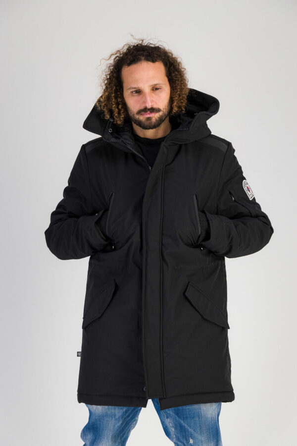 Cette parka présente également des finitions soignées et discrètes qui renforcent sa fonctionnalité : fermeture zippée frontale dissimulée sous une patte protectrice, poches pratiques pour les effets personnels, capuche intégrée pour une protection complète contre les intempéries.