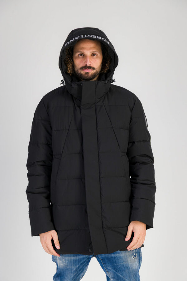 La fermeture zippée frontale est dissimulée sous un rabat protecteur qui renforce l’esthétique minimaliste du modèle. La capuche intégrée est réglable, pensée pour offrir une meilleure protection face aux intempéries. Les poignets sont ajustés pour limiter les entrées d’air froid.